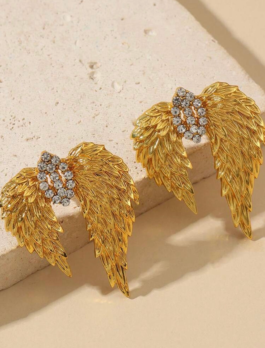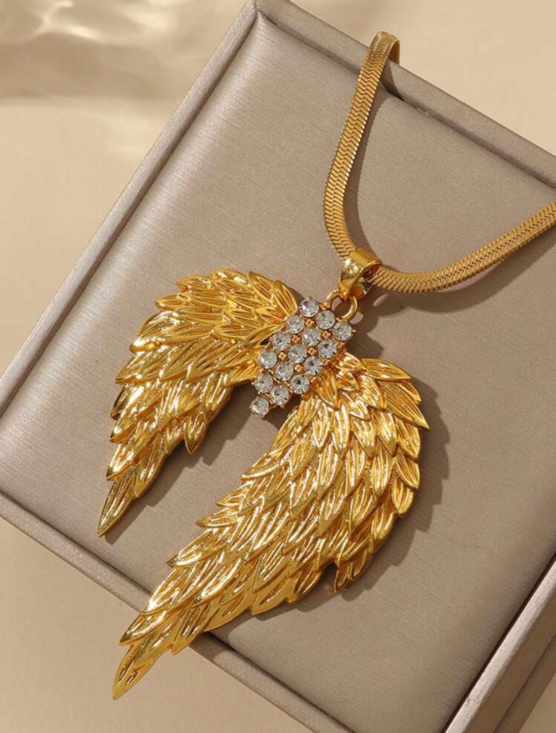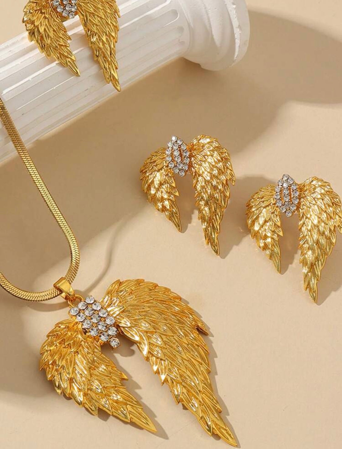Set 4 piezas collar + dije de alas de ángel doradas + aretes + anillo / Acero Inoxidable